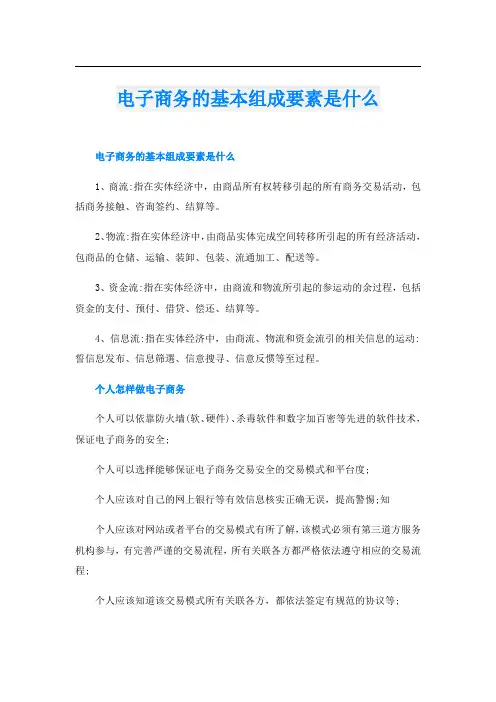 电子商务的基本组成要素电子商务(EC)是指在电子网络环境中进行的商业活动,它包括在网上进行商业活动和管理商业活动。