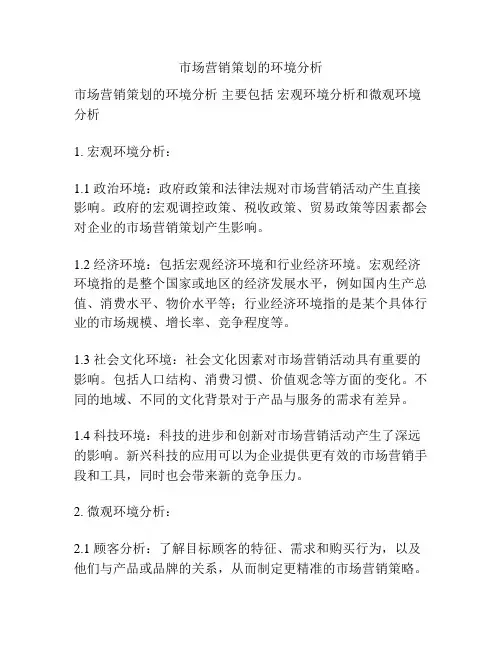 市场营销策划的环境分析市场营销策划的环境分析主要包括宏观环境分析和微观环境分析1. 宏观环境分析:1.1 政治环境:政府政策和法律法规对市场营销活动产生直接影响。