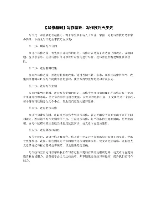 下面是写作的基本技巧五步走:第一步:明确写作目的在进行写作之前,首先要明确写作的目的。