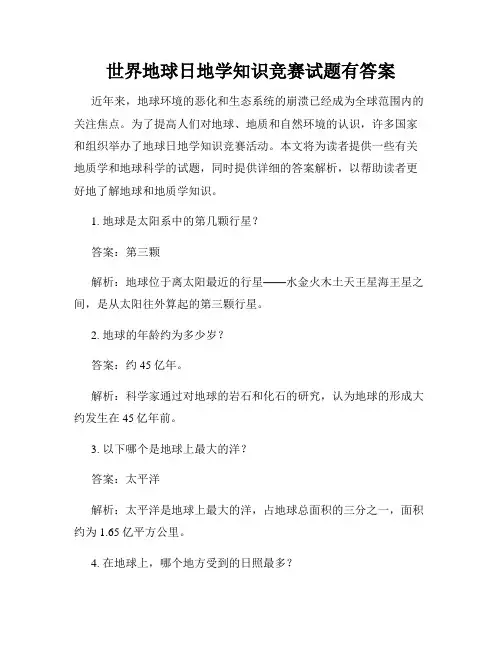 以下是竞赛的试题及答案,让我们一起来看看吧!第一部分:地球的基本知识1. 地球是太阳系中的第几颗行星?答案:第三颗。