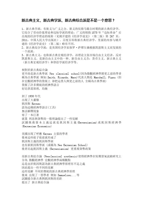 新古典主义、新古典学派、新古典综合派是不是一个意思?1、新古典学派:有狭义与广义之分,狭义的仅指马歇尔时期的新古典经济学,它综合了劳动价值理论和边际学派的理论;广义的则指1870年“边际革命”后出现的经济学理论的统称(见姚开建的《经济学说史》(第二版)第267页,2011,中国人民大学出版社)。