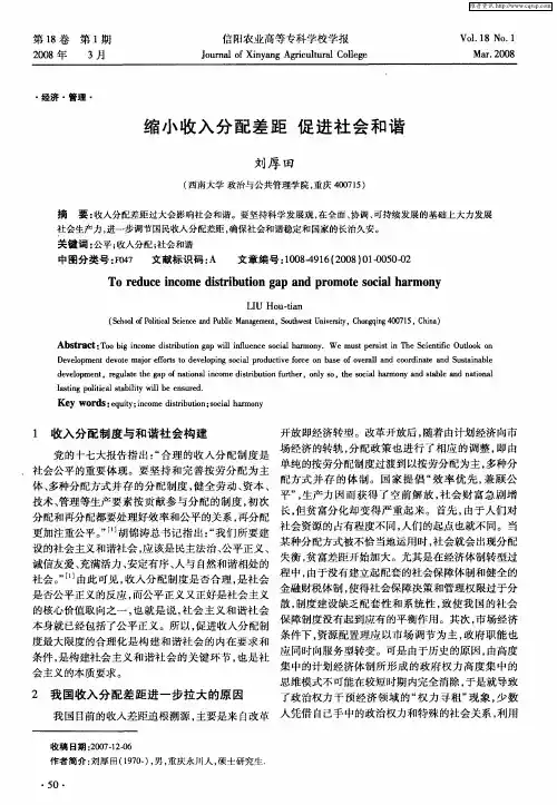 居民收入分配差距与和谐社会的辩证关系1.收入分配差距导致社会阶层的隔阂当收入分配差距较大时,可将社会成员划分为两个主要部分———富人阶层和穷人阶层。