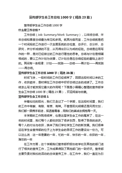 宣传部学生会工作总结1000字(精选23篇)宣传部学生会工作总结1000字什么是工作总结?工作总结(Job Summary/Work Summary),以年终总结、半年总结和季度总结最为常见和多用。