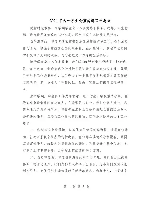 2024年大一学生会宣传部工作总结随着时光推移,本学期学生会工作圆满落下帷幕。