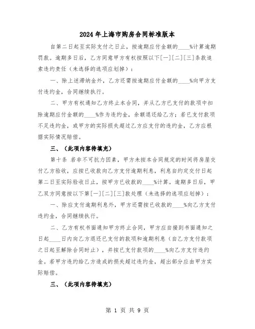 20XX 专业合同封面COUNTRACT COVER甲方:XXX乙方:XXX上海市房产购买合同(2024修订版)本合同目录一览第一条房屋基本信息1.1 房屋位置1.2 房屋面积1.3 房屋户型1.4 房屋所有权证号第二条购买方信息2.1 购买方姓名2.2 购买方身份证号2.3 购买方联系方式第三条出售方信息3.1 出售方姓名3.2 出售方身份证号3.3 出售方联系方式第四条房屋交易价格4.1 成交价格4.2 付款方式4.3 付款时间第五条房屋交付时间5.1 交付日期5.2 交付条件第六条房屋质量保证6.1 质量标准6.2 质量问题处理方式第七条税费承担7.1 交易税费7.2 过户税费7.3 其他税费第八条房屋产权转移8.1 产权转移登记时间8.2 产权转移登记费用第九条违约责任9.1 违约行为9.2 违约责任承担方式第十条争议解决方式10.1 争议解决途径10.2 争议解决时效第十一条合同的变更和解除11.1 变更条件11.2 解除条件第十二条保密条款12.1 保密内容12.2 泄露后果第十三条合同的生效、变更和解除13.1 生效条件13.2 变更条件13.3 解除条件第十四条其他条款14.1 双方约定的其他事项14.2 法律法规规定的其他事项第一部分:合同如下:第一条房屋基本信息1.1 房屋位置1.2 房屋面积1.3 房屋户型1.4 房屋所有权证号房屋所有权证号为____,房屋所有权证由出售方持有,并应在合同签订后____个工作日内提供给购买方。