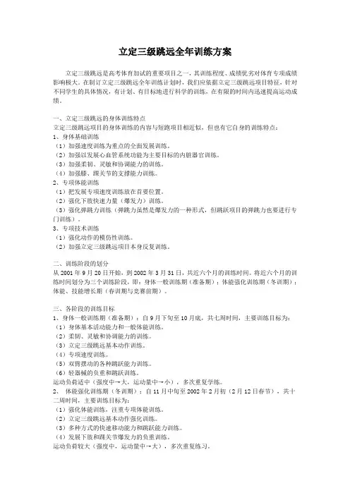 一、力量训练力量是三级跳远运动员的基本素质之一,可以通过以下几种方法进行力量训练:1.重量训练:可以通过负重训练、哑铃训练和杠铃训练等方式增加肌肉力量。