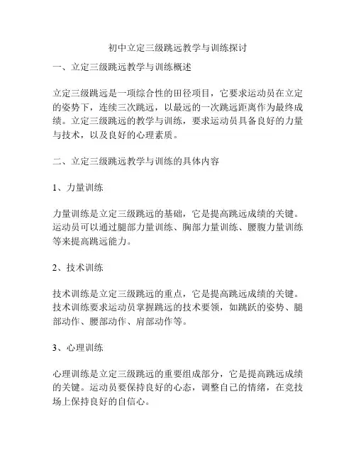 二、训练方法1.爆发力训练爆发力是三级跳远中非常重要的一项素质,它决定了运动员起跳的高度和弹跳力。