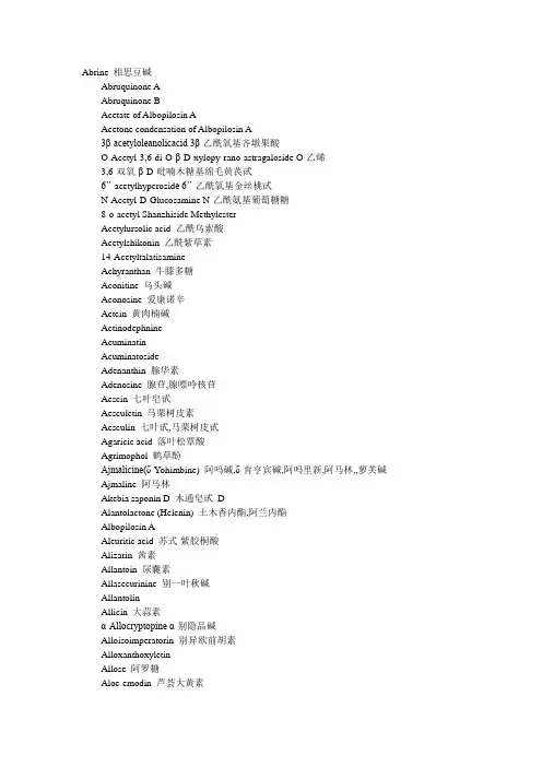 中草药成分词汇中英对照Abrine 相思豆碱O-Acetyl-3,6-di-O-β-D-xylopy-rano- astragaloside O-乙烯 3,6-双氧-β-D- 吡喃木糖基绵毛黄芪甙Acetylastragaloside 乙酰黄芪甙N-Acetyl-D-Glucosamine N-乙酰氨基葡萄糖糖6''-acetylhyperoside 6''-乙酰氧基金丝桃甙Acetylshikonin 乙酰紫草素14-Acetyltalatisamine Achyranthan 牛膝多糖Acobreting D 短距乌头碱丁Acobreting E 短距乌头碱戊Aconine 乌头原碱Aconitine 乌头碱Aconosine 爱康诺辛Actein 黄肉楠碱Actinodephnine Acuminatin Acuminatoside Adenanthin 腺华素Adenine 腺嘌呤Adenoside 腺苷Adynerin 欧夹竹桃甙乙Aescin 七叶皂甙Aesculetin 七叶素七叶内脂,秦皮乙素马栗树皮素Aesculin 七叶甙马栗树皮甙Agaricic acid 落叶松覃酸Agaricus blazei murrill P.E 姬松茸提取物Agrimophol 仙鹤草酚Ajmalicineδ-Yohimbine 阿吗碱,δ-育亨宾碱,阿吗里新Ajmaline 阿马林Akebia saponin D 木通皂甙 DAlantolactone 土木香内酯Albopilosin A Aleuritic acid 苏式-紫胶桐酸Alfalfa P.E 紫苜蓿提取物Alizarin 茜素Alkaloids 罗勒生物碱Allantoin 尿囊素Allasecurinine 别一叶秋碱Allantolin Allicin 大蒜素α-Allocryptopine α-别隐品碱Alloisoimperatorin 别异欧前胡素Alloxanthoxyletin Allose 阿罗糖Aloeemodin 芦荟大黄素Aloe-saponol Aloin 芦荟甙Aloesin 芦荟苦素Aloperin 苦豆碱Alpinetin 山姜素Amentoflavone 1- Amino-cyclopropane-1-acid hydrochloride 1-氨基环丙烷-1-羧酸盐酸盐Amethystoidin A 香茶菜甲素Ampelopstin 福建茶素Amygdalase 苦杏仁酶Amygdalin 苦杏仁甙Aamylase 淀粉酶β-Amyrin β-香树脂醇α-Amyrin acetate α-香树脂醇乙酸乙酯β-Amyrin acetate β-香树脂醇乙酸乙酯β-Amyrin palmitate 棕榈酰β-香树酯Anabasine 毒藜碱Anagyrine 臭豆碱,安那吉碱Andrographis Paniculata P.E 穿心莲提取物Andrographolide 穿心莲内酯穿心莲乙素Anemonin 白头翁素Angelica Dongquai P.E 当归提取物Anisodamine 山莨菪碱Anisodine 樟柳碱Anthocyanosides 花色素Anthraglycoside A 大黄素-6-甲醚-8-D-葡萄糖甙Anthraglycoside B 大黄素-8-D-葡萄糖甙Apigenin 芹菜甙元芹菜素Apigenin-7-glucoside 芹菜甙元-7- 葡萄糖甙Apigenin-7-O-glucoside 芹菜甙元-7- O-葡萄糖甙Apigenin-8-O-glucoside 芹菜甙元-8- O-葡萄糖甙Apigenin-7-O-α-L-rhamnoside 芹黄素-7-O-α-L-鼠李糖甙 Apiin 芹菜甙Apple Extract 苹果提取物Araloside A 楤木皂甙 AArbutin 熊果甙Arctigenin 牛蒡甙元Arctiin 牛蒡子甙Arctinal 牛蒡子醛Arctinol b 牛蒡子醇-bAristolactone 马兜铃内酯Aristolochic acid A, D 马兜铃酸A,DAristolochic acid B, C 马兜铃酸B,CArmillarisin A 亮菌甲素,假蜜环菌甲素Arteannuic acid 青蒿酸Arteannuin 青蒿素Artemisinin 青蒿提取物α-Artemether α-蒿甲醚β-Artemether β-蒿甲醚Artemetin 青蒿亭Artemisinic acid 春活力青蒿酸Arundoin 芦竹素Asarinin 细辛脂素α-Asaron α-细辛醚β-Asarone β-细辛醚Asiatic acid 积雪草酸Asiaticoside 积雪草甙Astilbin 落新妇甙Astragaloside 黄芪甙Astragalin Astragaloside II 黄芪皂甙 IIAstragaloside IV 黄芪甲甙Astragalus Root P.E 黄芪提取物Atisine chloride Atractydin 苍术素 Atractylon 苍术酮Atraotydin 苍术甙Atropine 阿托品Aucubin 桃叶珊瑚甙Avacularin 扁蓄甙Baicalein 黄芩素Baicalin 黄芩甙Baical Skullcap root P.E 黄芩提取物 Bakuchiol 补骨脂酚Bavachalcone 补骨脂查耳酮Barley Grass P.E 麦苗精提取物Beiwutine 北乌碱Benzoylmesaconitine 苯甲酰中乌头原碱 Berbamine 小檗胺Berbamine hydrochloride 盐酸小檗胺 Berberine 小檗碱Berberine hydrochloride 盐酸小檗碱 Bergapten 香柑内酯佛手柑内酯Bergaptol 佛手酚Bergenin 岩白菜素Betaine 甜菜碱Caffeic acid 咖啡酸Caffeine 咖啡碱Calcium Citrate Tricalcium citrate 柠檬酸钙 Calcium Malate 苹果酸钙+-Camphor 樟脑Camptothecine 喜树碱Cantharidin 斑蟊素Capillarisin 茵陈色原酮Capsaicin 辣椒碱Capsanthin 辣椒黄素Capsicum Extract 辣椒萃取物Capsorubin 辣椒红素Carthamidin 红花素Carthamin 红花甙Caryophyllene 石竹烯Cassia Nomame P.E 水皂角提取物Catalpol 梓醇Catalposide 梓甙Cat's claw P.E 猫爪草提取物Caudoside 考多甙Cedilanid 去乙酰毛花洋地黄甙Celery seed P.E 芹菜子提取物Cephalomannine 三尖杉宁碱Cepharanthine 头花千金藤碱Cerberin 单乙酰黄夹次甙乙Chammomile P.E 春黄菊提取物Charantin 苦瓜素Chast tree berry P.E 蔓荆子提取物 Chenodeoxycholic acid 鹅去氧胆酸 Chinese Angelica Extrat 当归提取物 Chlorogenic acid 绿原酸Cholic acid 胆酸CHONDROITIN SULFATE 硫酸软骨素Chrysophanol 大黄酚Chuanxiongzine 川芎嗪Cimside A B E 升麻甙A B ECinchonidine 辛可尼丁Cinchonine 辛可宁Cinnamaldehyde 桂皮醛Cinnamic acid 桂皮酸Citrus seed P.E 枳实提取物Clerodolone 赤桐酮醇Clerodone 赤桐酮Clerosterol 赤桐甾醇Cleupin 橄榄苦甙Cocaine 可卡因Cocculine 衡州乌药灵Coclaurine 乌药碱Codeine 可待因Codonopsis P.E. 党参提取物Colchicine 秋水仙碱Common cnidium fruit P.E 蛇床子提取物 Conjugated Linoleic Acid CLA 共轭亚油酸 Convallatoxin 铃兰毒甙Convallatoxol 铃兰毒醇甙Coptisine 黄连碱Corchoroside A 黄麻甙 ACordatanine 荷莲豆碱Cordyceps P.E 虫草提取物Coriamyrtin 马桑内酯Coriatin 马桑亭Coriolus Versicolor P.E. 云芝提取物Corn silk P.E 玉米须提取物+-Corydaline 紫堇碱Corydalis P.E 延胡索提取物Coryfolin 补骨脂甲素Corylifolinin 补骨脂乙素Corynoxeine 去氢钩藤碱Crocin 番红花素Cryptotanshinone 隐丹参酮Cucurbitacin B 葫芦素BCucurbitacin E 葫芦素ECucurbitacin glucoside 雪胆甲素甙Cucurbitine 南瓜子氨酸Ar-Curcumene 芳-姜黄烯Curcumol 莪术醇Curdione 莪二酮Curine 箭毒碱Cyanotis arachnoides P.E 露水草提取物Cyclanoline 轮环藤酚碱Cycleanine 轮环藤碱Cyclovirobuxine 黄杨木提取物黄杨碱Cymarin 加拿大麻甙p-Cymene 对-聚伞花素Dahurian Rhododendron Leaf P.E 
