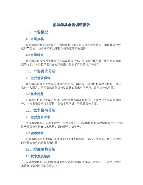 教学器具市场调研报告一、市场概况1.1 市场规模根据最新的数据统计显示,教学器具市场在过去几年持续增长,市场规模已经达到X亿元,预计在未来几年将保持稳定增长的趋势。