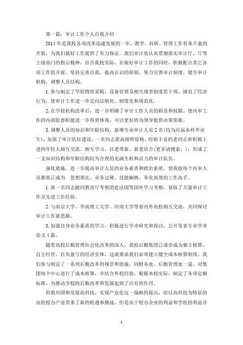 审计工作个人自我介绍(精选多篇)第一篇:审计工作个人自我介绍2022年是我校各项改革迅速发展的一年,教学、科研、管理工作有条不紊的开展,为我们搞好工作提供了有力保证。