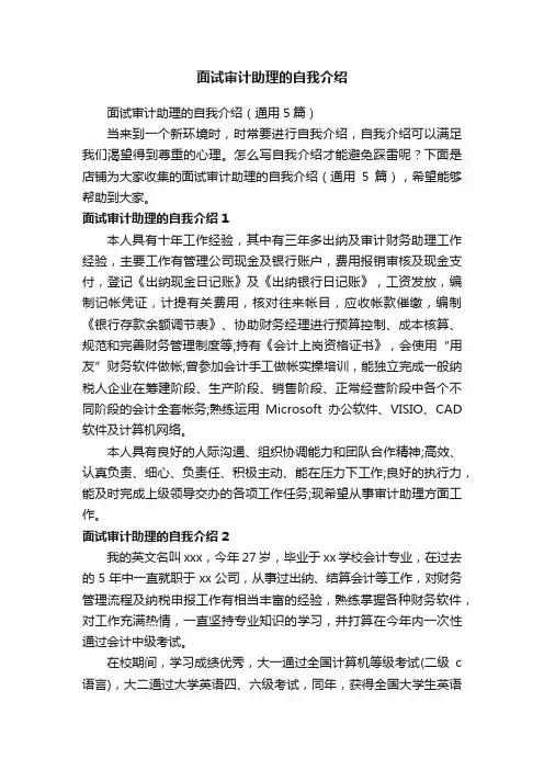 怎么写自我介绍才能避免踩雷呢?下面是店铺为大家收集的面试审计助理的自我介绍(通用5篇),希望能够帮助到大家。