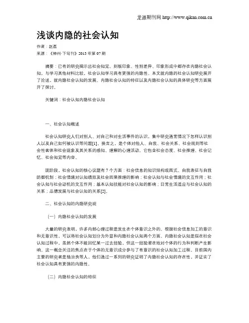 浅谈内隐的社会认知作者:赵荔来源:《神州·下旬刊》2013年第07期摘要:已有的研究揭示出社会知觉、刻板印象、性别差异、印象形成中都存在内隐社会认知,与学习其他材料比较,社会认知学习具有更强的内隐性。