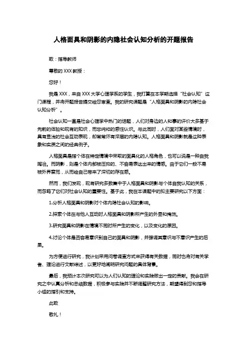 人格面具和阴影的内隐社会认知分析的开题报告致:指导教师尊敬的XXX教授:您好!我是XXX,来自XXX大学心理学系的学生,我打算在本学期选择“社会认知”这门课程,并将开题报告提交给您审查。