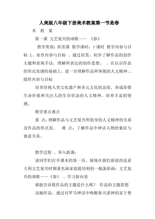 人美版八年级下册美术教案第一节是春术教案第一课文艺复兴的颂歌——《春》教学类别:欣赏课教学课时:1课时教学内容与目标 1、显性内容与目标、通过欣赏,初步了解作品的创作主题和表现手法,理解所表达的创作思想。