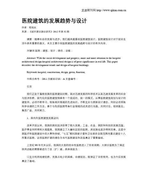 医院建筑的发展趋势与设计作者:程炳炎来源:《城市建设理论研究》2012年第32期摘要:随着社会的发展与进步,我们越来越重视医院建筑设计,医院建筑设计对于现实生活中具有重要的意义。