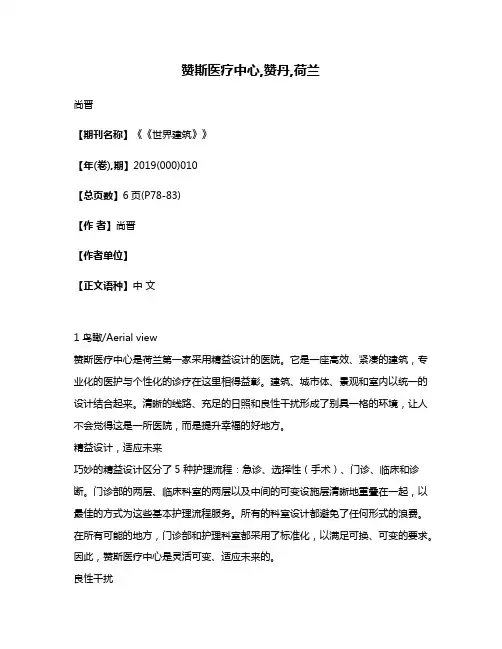 赞斯医疗中心,赞丹,荷兰尚晋【期刊名称】《《世界建筑》》【年(卷),期】2019(000)010【总页数】6页(P78-83)【作者】尚晋【作者单位】【正文语种】中文1 鸟瞰/Aerial view赞斯医疗中心是荷兰第一家采用精益设计的医院。