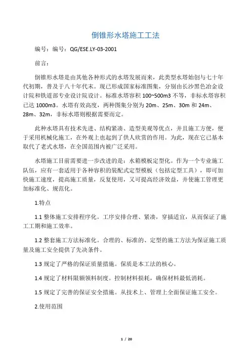 100T倒锥水塔施工方案建设单位:施工单位:目录一、编制依据二、工程概况三、支筒滑模施工,水箱提升机械设备平面体置四、施工顺序五、水箱支筒滑模施工前的准备六、滑升设备组装、拆除七、支筒滑模施工工艺八、倒锥水箱予制施工九、倒锥水箱提升工艺十、质量要求与措施十一、安全技术措施十二、主要机械用量表十三、水箱提升设备布置图十四、施工进度计划横道图一:编制依据:1、中冶赛迪公司设计的施工图纸(图号00410194DR3112ST100-1~5);2、《滑动模板工程技术规范》GB50113-2005;3、《液压滑动模板施工安全技术规范》JGJ65-894、《建筑施工高处作业安全技术规程》JGJ80-91;5、《混凝土结构工程施工质量验收规范》GB50204-2011;6、《建筑物防雷工程施工与质量验收规范》GB50601-20107、《施工现场临时用电安全技术规范》JGJ46-2005;8、《建筑施工安全检查标准》JGJ59-2011;9、中冶天工上海十三冶程序文件、施工规程、相关制度文件等企业内部管理标准。