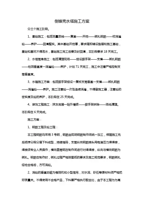 钢筋混凝土倒锥壳保温水塔施工方案一、项目背景钢筋混凝土倒锥壳保温水塔是一种重要的水工建筑,具有结构稳定、耐用、保温性能好等优点,适用于各种城市和农村供水系统。