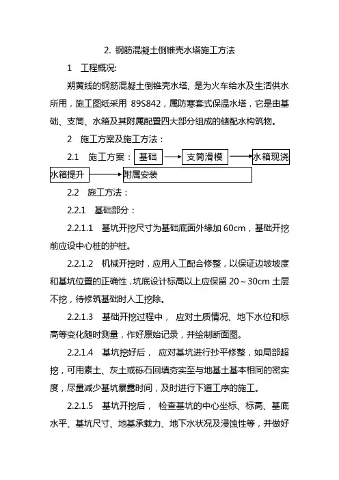 2. 钢筋混凝土倒锥壳水塔施工方法1 工程概况:朔黄线的钢筋混凝土倒锥壳水塔, 是为火车给水及生活供水所用,施工图纸采用89S842,属防寒套式保温水塔,它是由基础、支筒、水箱及其附属配臵四大部分组成的储配水构筑物。