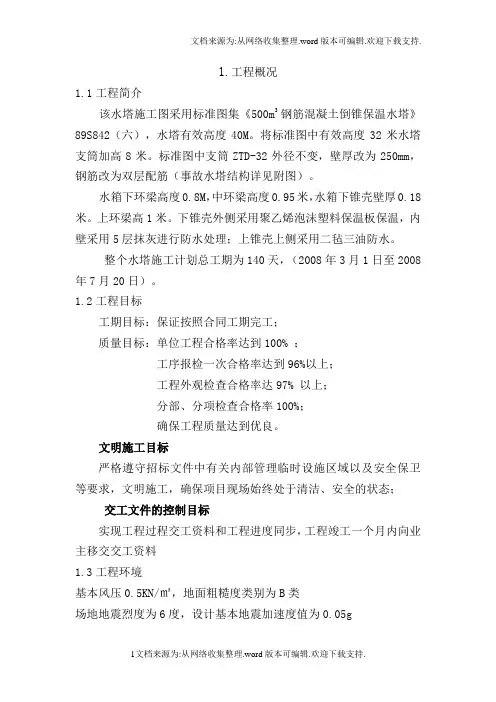 1.工程概况1.1工程简介该水塔施工图采用标准图集《500m3钢筋混凝土倒锥保温水塔》89S842(六),水塔有效高度40M。