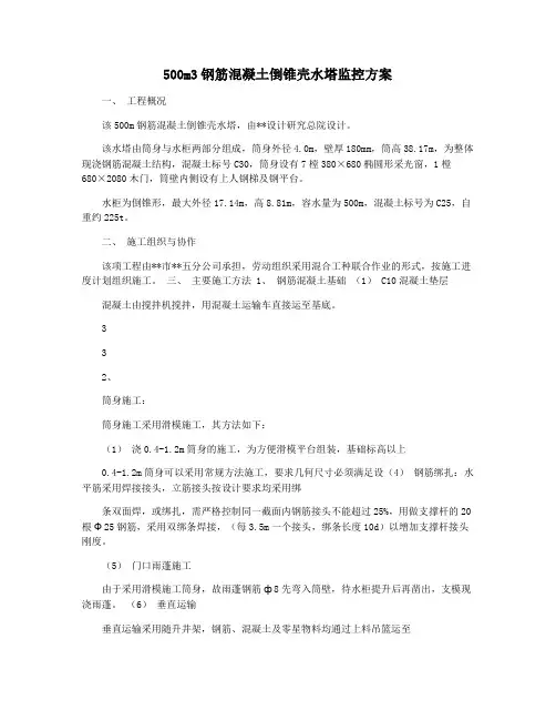 500t/30m钢筋混凝土倒锥壳水塔(不保温)施工组织设计方案(参考图集号:94S844Z六、94S844六C)一、工程概况1、工程建设概况2、建筑设计概况:本水塔由基础、筒身、环板、水箱、气窗顶盖、给排水管道、爬梯、避雷设施、照明、水位自动控制系统组成,施工程序是:现浇基础,支筒采用支架滑升施工工艺(因本工程为特性构筑物,施工要求不宜留设施工缝,包括基础及水箱,所以极力建议支筒施工采用滑升施工工艺,以保障混凝土施工的连结续性,且施工队伍必须由在证水塔专业施工队伍承担),现浇环板、水箱、砼到达一定强度后拆模。