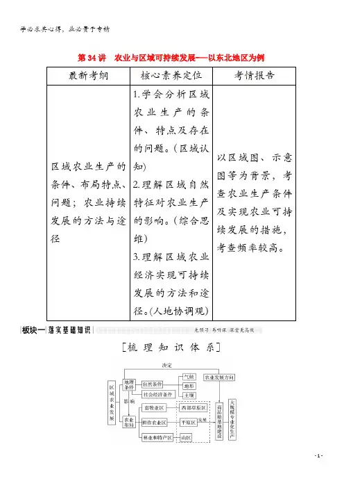 2020届高三地理复习讲解:区域农业的可持续发展一、知识梳理一、区域农业可持续发展的条件1.区域农业发展的自然地理条件农业发展必须建立在自然条件基础之上,气候、地形、土壤条件是农业发展的关键性因素,面对不同的区域,要找出发展某种农业部门所需的条件,因地制宜发展农业生产。