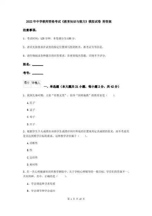 2022年中学教师资格考试《教育知识与能力》提升训练试题A卷附解析注意事项:1、考试时间:120分钟,本卷满分为150分。