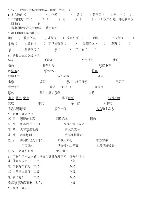 .2.一词多义辨析3.词类活用解说( 1)欲箠杀之活用词语:箠解说:名词作状语,用鞭子(打)( 2)布被覆尸活用词语:布被解说:名词作状语,用布被4.古今异义划分( 1)使宣叩首谢.主古义:认错。