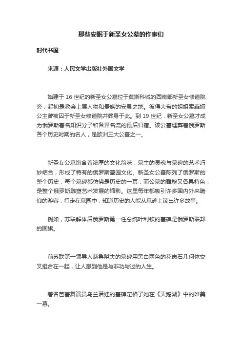 那些安眠于新圣女公墓的作家们时代书屋来源:人民文学出版社外国文学始建于16世纪的新圣女公墓位于莫斯科城的西南部新圣女修道院旁,起初是教会上层人物和贵族的安息之地。