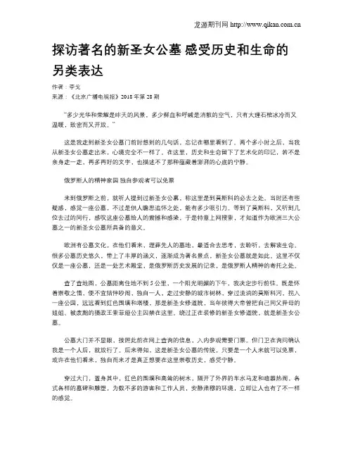 清凉的新圣女公墓-精美散文清凉的新圣女公墓-精美散文去新圣女公墓是个自费景点,每人150元人民币,按旅游团最后下发的“出团通知书”上的旅游日程,这个景点是编排在最后一天的最后一个,而我们团到莫斯科的第一天便告诉我们去了红场之后就去新圣女公墓,好端端排在最后的“压轴戏”一下子移到了前面。