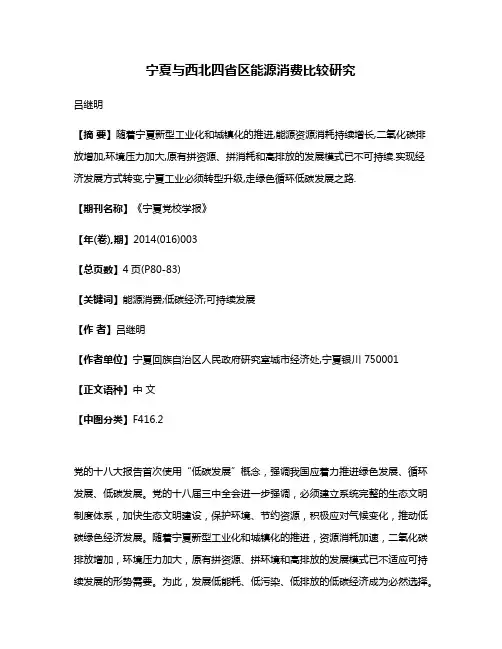 宁夏与西北四省区能源消费比较研究吕继明【摘要】随着宁夏新型工业化和城镇化的推进,能源资源消耗持续增长,二氧化碳排放增加,环境压力加大,原有拼资源、拼消耗和高排放的发展模式已不可持续.实现经济发展方式转变,宁夏工业必须转型升级,走绿色循环低碳发展之路.【期刊名称】《宁夏党校学报》【年(卷),期】2014(016)003【总页数】4页(P80-83)【关键词】能源消费;低碳经济;可持续发展【作者】吕继明【作者单位】宁夏回族自治区人民政府研究室城市经济处,宁夏银川 750001【正文语种】中文【中图分类】F416.2党的十八大报告首次使用“低碳发展”概念,强调我国应着力推进绿色发展、循环发展、低碳发展。