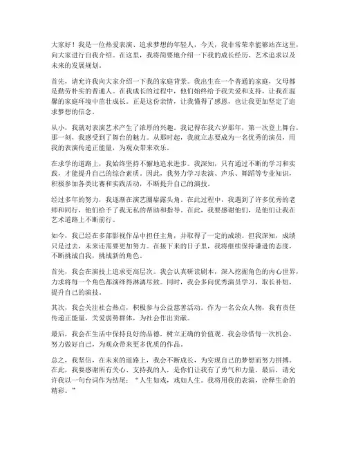我是一名热爱表演艺术的年轻演员,我将用自己的____字,向大家介绍一下我自己。