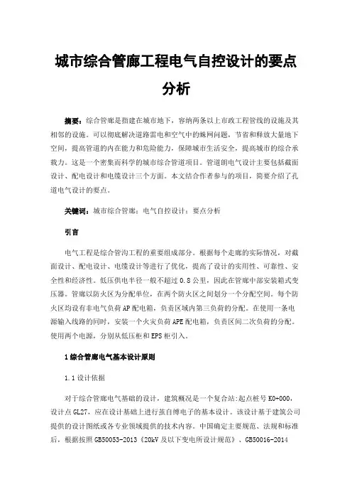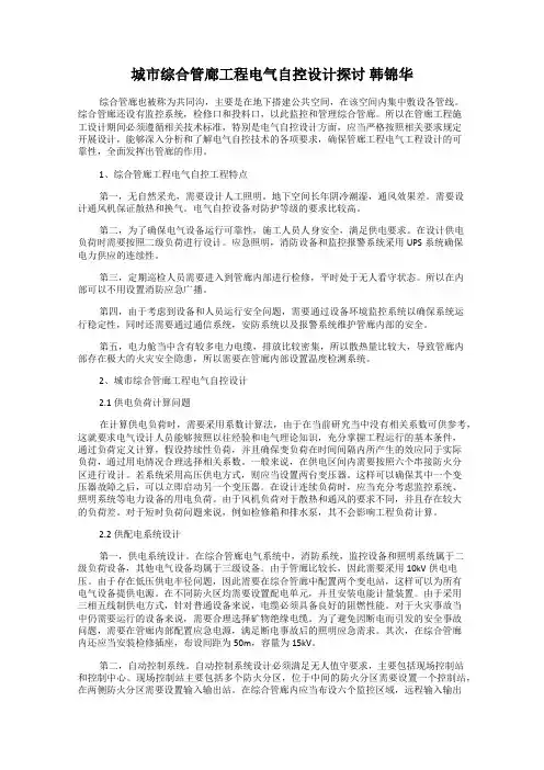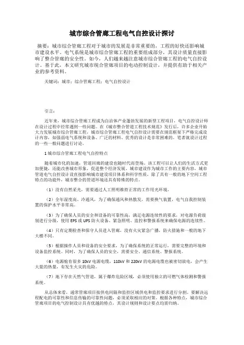 城市综合管廊工程电气自控设计探讨————————————————————————————————作者:————————————————————————————————日期:城市综合管廊工程电气自控设计探讨\近年来,城市综合管廊工程成为市政行业大力发展的新兴工程项目种类,电气自控专业设计人员在设计过程中经常会遇到一些共同的问题。