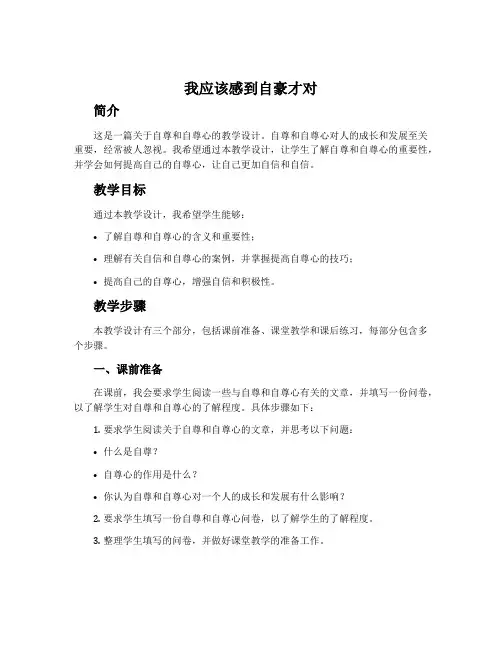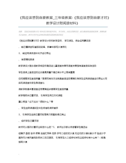 《我应该感到自豪才对》教学设计附阅读材料教学教案一、教学目标1. 让学生通过阅读《我应该感到自豪才对》,理解故事内容,体会故事中的情感。