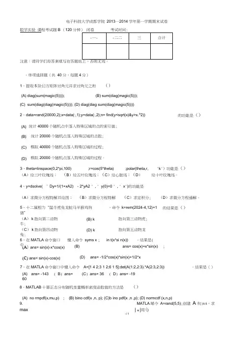 ………密………封………线………以………内………答………题………无………效……电子科技大学成都学院2013—2014学年第一学期期末试卷数学实验 课程考试题B (120分钟) 闭卷 考试时间: 2014.3.8注意:请同学们将答案填写在答题纸上,否则无效。