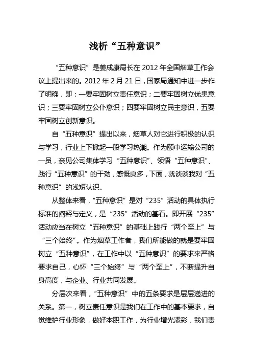 浅谈基层烟草部门如何正确树立“五种意识”内部专卖管理监督派驻组当前烟草行业已经进入一个快速发展时期,各项业绩令人鼓舞,成就催人振奋。