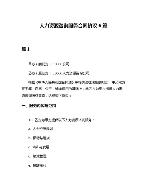 人力资源咨询服务协议书7篇篇1甲方(客户):[公司名称]地址:[公司地址]联系人:[联系人姓名]联系电话:[联系电话]乙方(服务提供商):[公司名称]地址:[公司地址]联系人:[联系人姓名]联系电话:[联系电话]鉴于甲方需要人力资源咨询服务,乙方具备相关服务能力,双方经友好协商,达成如下协议:一、服务内容1. 乙方将向甲方提供人力资源咨询服务,包括但不限于以下几个方面:(1)人力资源管理策略制定(2)人力资源规划(3)人力资源招聘与录用(4)人力资源培训与发展(5)人力资源绩效评估(6)人力资源薪酬福利管理(7)人力资源劳动关系管理2. 乙方将按照甲方的要求,提供专业化、个性化的人力资源咨询服务。