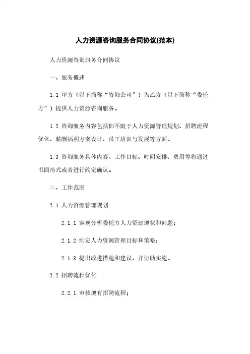 人力资源咨询服务合同协议(范本)人力资源咨询服务合同协议一、服务概述1.1 甲方(以下简称“咨询公司”)为乙方(以下简称“委托方”)提供人力资源咨询服务。
