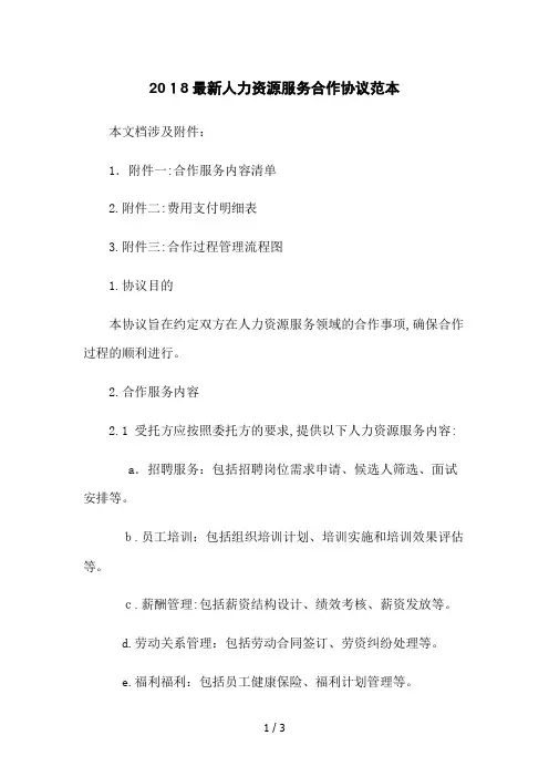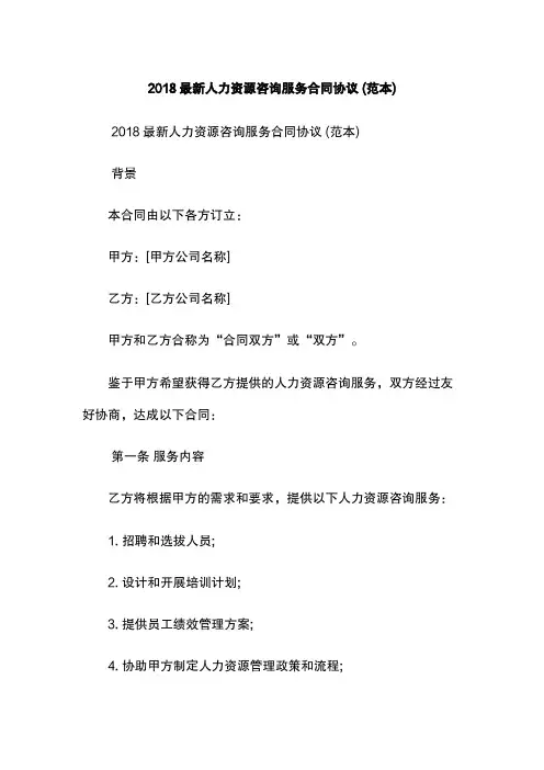 2018最新人力资源咨询服务合同协议 (范本) 2018最新人力资源咨询服务合同协议 (范本)背景本合同由以下各方订立:甲方:[甲方公司名称]乙方:[乙方公司名称]甲方和乙方合称为“合同双方”或“双方”。