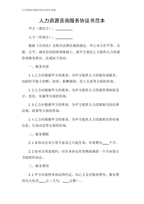人力资源咨询服务协议书范本甲方(委托方):__________乙方(咨询方):__________根据《合同法》及相关法律法规的规定,甲乙双方在平等、自愿、公平、诚实信用的原则基础上,就甲方委托乙方提供人力资源咨询服务事宜,达成如下协议:一、服务内容1.1乙方应根据甲方的要求,为甲方提供人力资源咨询服务,包括但不限于招聘、培训、薪酬福利、员工关系等方面的咨询。