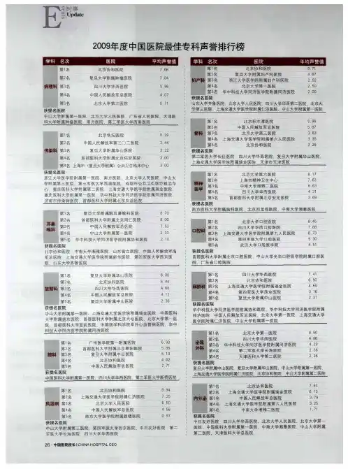 多发性骨髓瘤1.中国医科院血液病医院2.上海交通大学医学院附属瑞金医院3.北京大学人民医院4.苏州大学附属第一医院5.浙大医学院附属一院6.武汉协和医院7.北京协和医院8.四川大学华西医院9.中国人民解放军总医院10.山东大学齐鲁医院05、神经内科主要疾病:脑梗塞、癫痫、头痛、帕金森、头晕、脑出血、抑郁症、失眠、脑血栓、老年痴呆等1.北京协和医院2.上海华山医院3.首都医科大学宣武医院4.中山大学附属第一医院5.四川大学华西医院6.北京天坛医院7.吉林大学第一医院8.湖南湘雅医院9.解放军总医院10.上海瑞金医院和武汉同济医院06、神经外科主要疾病:脑外伤、脑肿瘤、三叉神经痛、脑膜瘤、垂体腺瘤、胶质瘤1.北京天坛医院2.上海华山医院3.四川大学华西医院4.解放军总医院5.天津医科大学总医院6.首都医科大学宣武医院7.湖南湘雅医院8.西安西9.哈尔滨医科大学附属第一医院10.山东大学齐鲁医院07、精神疾病主要疾病:抑郁、焦虑、强迫症、情感障碍、精神分裂症、孤独症、多动症、心理干预、成瘾戒治1.北京大学第六医院2.上海市精神卫生中心3.湖南湘雅二医院精神卫生中心4.四川大学华西医院心理卫生中心5.北京安定医院6.南京医科大学附属脑科医院7.广州市脑科医院8.北京回龙观医院9.武汉大学人民医院精神卫生中心10.深圳市康宁医院08、骨科主要疾病:骨折、颈椎病、腰椎病等脊柱疾病,人工关节置换,断肢再植,关节软骨损伤,骨肿瘤1.北京积水潭医院2.解放军总医院3.北京大学第三医院4.上海交大第六医院5.北京协和医院6.四川大学华西医院7.上海长征医院8.北京大学人民医院9.南京鼓楼医院10.上海瑞金医院09、皮肤科主要疾病:白癜风、银屑病、黄褐斑、硬皮病、真菌病、顽固性湿疹、红斑狼疮皮肤损害、皮肌炎、大疱病等1.上海华山医院2.中国医学科学院皮肤病医院3.北京大学第一医院4.中国医科大学附属第一医院(沈阳)5.安徽医科大学第一附属医院6.北京协和医院7.西8.上海瑞金医院9.中南大学湘雅二医院10.杭州市第三人民医院10、小儿内科主要疾病:感染性肺炎、脑膜炎、智力发育障碍、腹泻、支气管哮喘、急性贫血、性早熟、癫痫等1.北京儿童医院2.复旦大学附属儿科医院3.中国医科大学盛4.上海交通大学医学院附属新华医院5.重庆医科大学附属儿童医院6.武汉同济医院7.上海儿童医学中心8.广州市妇女儿童医疗中心9.首都儿科研究所10.浙江儿童医院11、妇产科主要疾病:妇科肿瘤、子宫肌瘤、子宫内膜异位症、不孕不育、盆底功能障碍性疾病、妊娠合并症及并发症1.北京协和医院2.复旦大学附属妇产科医院3.浙江大学医学院附属妇产科医院4.武汉同济医院5.北京大学人民医院6.四川大学华西第二医院7.山东大学齐鲁医院8.北京大学第一医院9.北京大学第三医院10.中国医科大盛12、内分泌主要疾病:糖尿病、甲状腺疾病、尿崩症、矮小症、性发育异常、代谢性骨病等1.上海瑞金医院2.北京协和医院3.中国人民解放军总医院4.中南大学湘雅二医院5.上海市第六人民医院6.四川大学华西医院7.中国医科大学附属第一医院8.中日友好医院9.北京大学第一医院10.中山大学附属第二医院13、眼科主要疾病:白内障、青光眼、眼底病、眼肿瘤、眼外伤、角膜病、屈光不正、小儿斜视与弱势等1.中山大学中山眼科中心2.北京同仁医院3.复旦大学附属眼耳鼻喉医院4.天津市眼科医院5.温州医学院附属眼视光医院6.北京大学人民医院7.北京协和医院8.北京大学第三医院9.浙大医学院附属第二医院10.山东省眼科研究所14、口腔科主要疾病:牙颌畸形、牙痛、口腔颌面部肿瘤、龋齿、牙髓炎、牙周炎、阻生齿、牙周病、口腔溃疡、牙体病等1.北京大学口腔医院2.四川大学华西口腔医院3.上海交大医学院附属第九人民医院4.口腔医院5.武汉大学口腔医院6.中山大学光华口腔医学院附属口腔医院7.首都医科大学附属北京口腔医院8.广东省口腔医院9.南京市口腔医院10.中国医科大学口腔医院15、耳鼻喉主要疾病:人工耳蜗植入、耳硬化、人工听觉技术、耳肿瘤、鼻咽癌、耳聋、扁桃体炎、慢性咽炎等1.复旦大学附属眼耳鼻喉科医院2.北京同仁医院3.解放军总医院4.北京协和医院5.武汉协和医院6.中山大学附属第一医院7.上海新华医院8.山东省立医院9.四川大学华西医院10.西安西、湖南湘雅医院16、风湿免疫病主要疾病:类风湿关节炎、强制性脊柱炎、系统性红斑狼疮、硬皮病、干燥综合征1.北京协和医院2.上海仁济医院3.北大人民医院4.解放军总医院5.南京鼓楼医院6.中山大学三院7.西安西8.四川大学华西医院9.中日友好医院10.上海长征医院17、肿瘤主要疾病:肺癌、乳腺癌、胃癌、肝癌、胰腺癌等消化系统肿瘤、妇科肿瘤、血液系统肿瘤等1.中国医科院肿瘤医院2.中山大学肿瘤防治中心3.复旦大学附属肿瘤医院4.天津医科大学附属肿瘤医院5.北京大学肿瘤医院6.山东省肿瘤医院7.浙江省肿瘤医院8.哈尔滨医科大学附属肿瘤医院9.四川大学华西医院10.江苏省肿瘤医院18、消化内科主要疾病:肠胃炎、胃肠肿瘤、胰腺炎、胰腺癌、胆石症、肝硬化、胃食管反流病、肠易激综合征等1.西安西2.北京协和医院3.解放军总医院4.上海交通大学医学院附属仁济医院5.第二军医大学附属长海医院6.上海交通大学医学院附属瑞金医院7.南方医科大学南方医院8.首都医科大学附属北京友谊