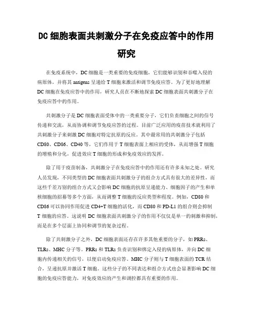 DC细胞表面共刺激分子在免疫应答中的作用研究在免疫系统中,DC细胞是一类重要的免疫细胞,它们能够识别和吞噬入侵的病原体,并将其 antigens 呈递给 T 细胞来激活和调节免疫应答。