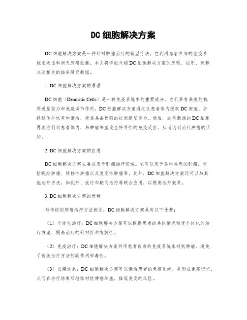 三、DC细胞解决方案的优势和应用价值1. 提高治疗效果DC细胞解决方案可以提高DC细胞的质量和数量,增强其抗原递呈和免疫调节能力,从而提高治疗效果。