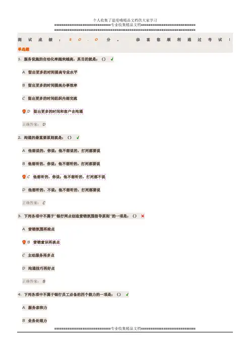 恭喜您顺利通过考试!单选题1. 服务设施的自动化率越来越高,其目的就是:()√A 留出更多的时间提高专业水平B 留出更多的时间提高办事效率C 留出更多的时间组织内部交流D 留出更多的时间和客户去沟通正确答案: D2. 沟通的最重要原则就是:()√A 他想说的,你说;他不想说的,打死都要说B 他想听的,你说;他不想听的,打死都要说C 他想听的,你说;他不想听的,打死都不说D 他想听的,不说;他不想听的,打死都要说正确答案: C3. 下列各项中不属于“银行网点创造营销氛围指导原则”的一项是:()×A 营销氛围再浓点B 营销意识再淡点C 主动服务再多点D 沟通技巧再好点正确答案: B4. 下列各项中不属于银行员工必备的四个能力的一项是:()√A 服务亲和力B 业务处理力C 现场管理力D 语言表达力正确答案: D5. 制约目前中国银行业营销的最大的瓶颈是:()√A 有没有营销意识和基本营销行为B 有没有服务意识和基本服务行为C 有没有质量意识和基本合作行为D 有没有合作意识和基本服务行为正确答案: A6. 未来银行业竞争是否健康的一个重要标志是:()√A 存贷之间的利润B 开发产品的利润C 行业服务的利润D 中间产品的利润正确答案: D7. 基层网点不可或缺的一个最重要的工作是:()√A 首先要把服务意识培养出来B 首先要把质量意识培养出来C 首先要把营销意识培养出来D 首先要把沟通意识培养出来正确答案: C8. 开通网银,送东西;开通网银,送礼品;甚至开通网银不要钱。