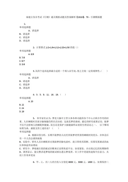 福建公务员考试《行测》通关模拟试题及答案解析【2019】:70 -行测模拟题1:单项选择题A、请选择B、请选择C、请选择D、请选择2:计算算式1/2+1/6+1/12+1/20+1/30的值()单项选择题A. 8/9B. 7/8C. 6/7D. 5/63:从四个选项选择最合适的一个填入问号处,使之呈现一定的规律性。