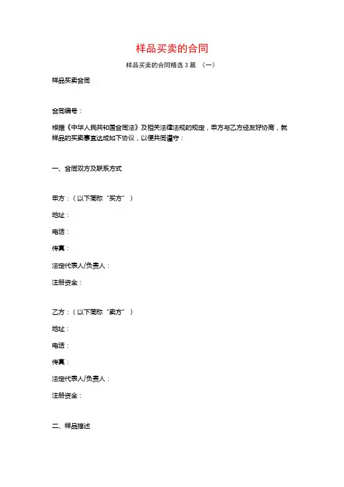 甲方(盖章):日期:乙方(盖章):日期:篇2样品买卖的合同范本甲方:(出售方名称)地址:法定代表人:电话:传真:乙方:(购买方名称)地址:法定代表人:电话:传真:一、货物名称、规格及数量甲方将以下样品出售给乙方,具体货物名称、规格及数量如下:货物名称:___________规格:___________数量:___________(具体数量以实际交付为准)二、价格及支付方式1、货物的总价为____________元(人民币),乙方应在签订本合同之日起____天内支付货款。