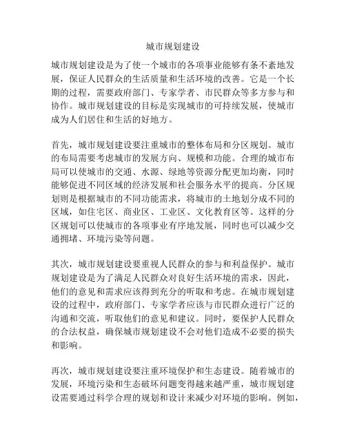 一、城市规划的意义城市规划是指对城市空间布局的宏观规划和细节设计,旨在合理利用城市土地资源,提高城市的功能性和宜居性。