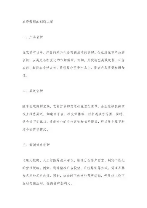 农资营销的创新之道一、产品创新在农资市场中,产品的差异化是营销成功的关键。