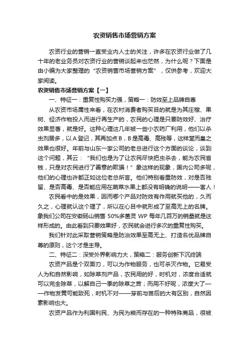 农资销售市场营销方案农资行业的营销一直受业内人士的关注,许多在农资行业做了几十年的老业务员对农资行业的营销谈起来也茫然,为什么呢?下面是由小编为大家整理的“农资销售市场营销方案”,仅供参考,欢迎大家阅读。