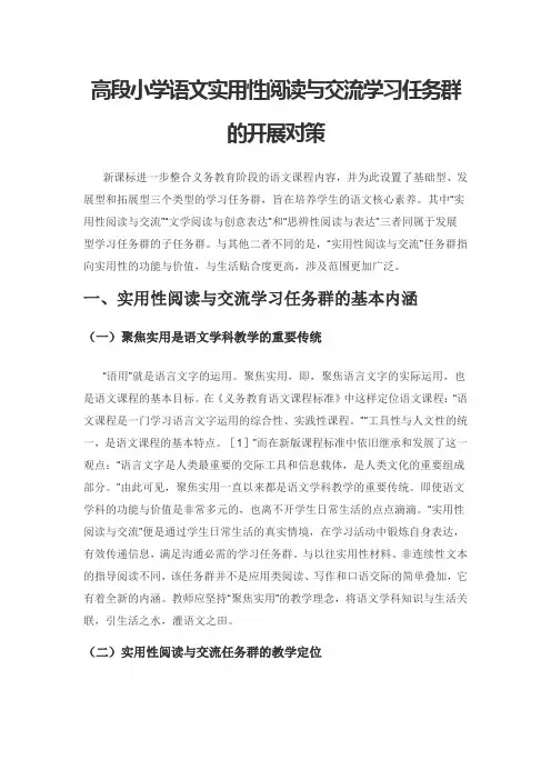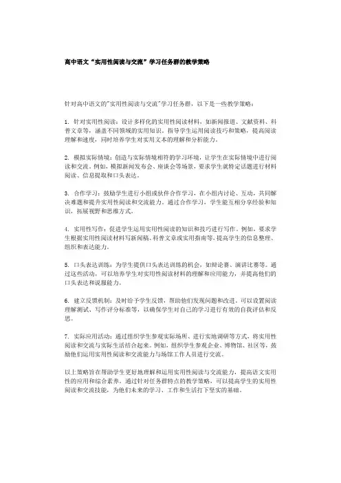 高中语文“实用性阅读与交流”学习任务群的教学策略针对高中语文的"实用性阅读与交流"学习任务群,以下是一些教学策略:1. 针对实用性阅读:设计多样化的实用性阅读材料,如新闻报道、文献资料、科普文章等,涵盖不同领域的实用知识。